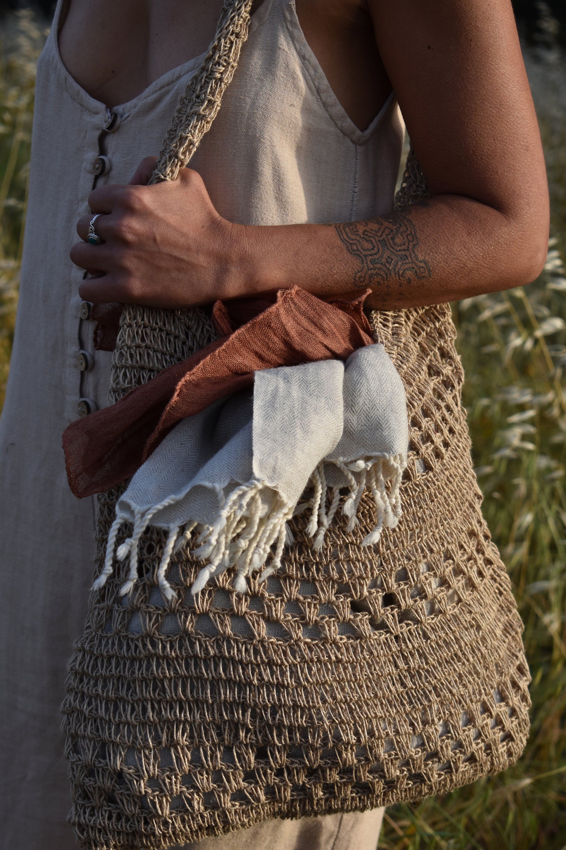 התיק עשוי מרשת יוטה איכותית ועמידה המקנה לו מראה טבעי ומרקם מעניין.