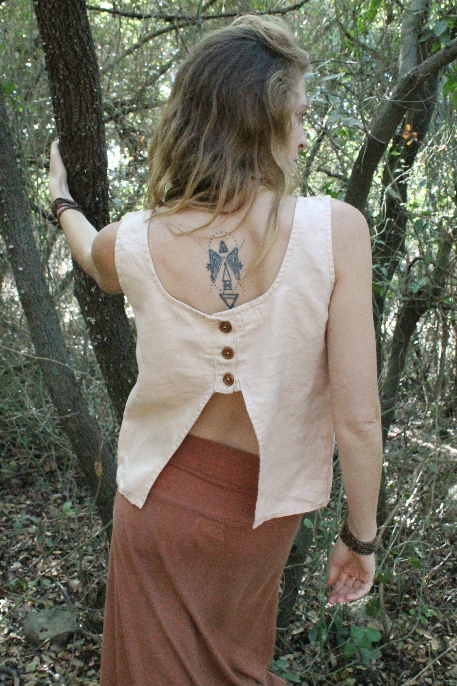 גופיית גב פתוחה עם שלושה כפתורי עץ מאחור. Loose Flowy.